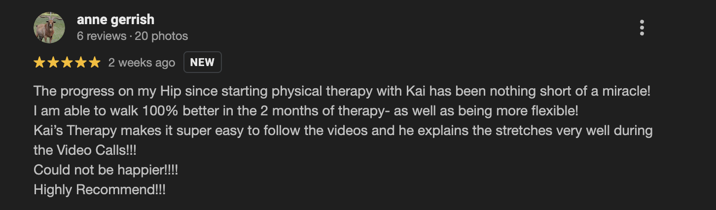 “With this being my first time trying physical therapy I didn't know what expectations to come in with but Kai certainly blew my expectations outta the park!”
