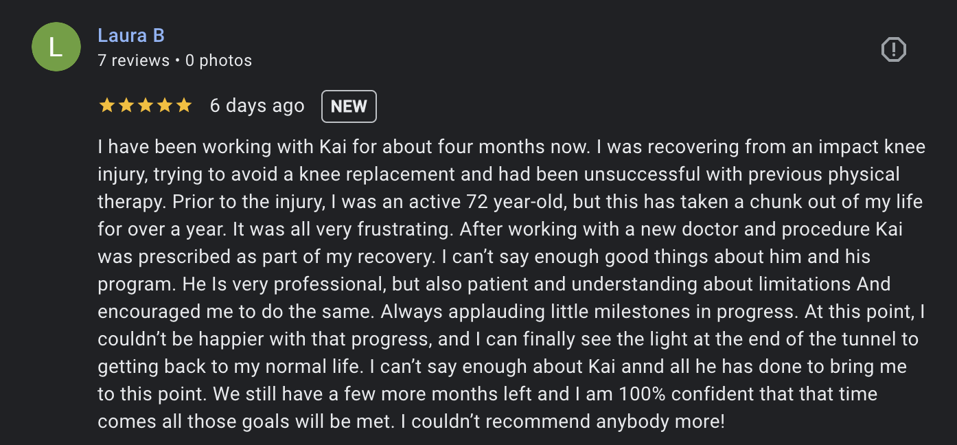 “With this being my first time trying physical therapy I didn't know what expectations to come in with but Kai certainly blew my expectations outta the park!”